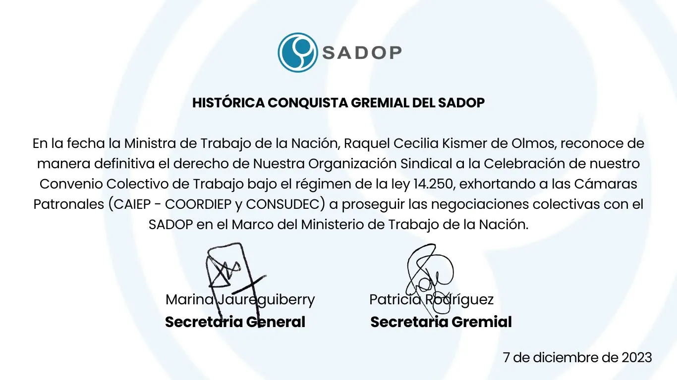En una declaración emitida esta tarde, la Ministra de Trabajo, Kelly Olmos, ha reconocido de manera definitiva el derecho del Sindicato Argentino de Docentes Privados (SADOP) a celebrar un Convenio Colectivo de Trabajo.