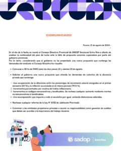 El Consejo Directivo Provincial de SADOP Seccional Entre Ríos ha resuelto convocar a 48 horas de paro para los días jueves 22 y viernes 23 de agosto, ante la falta de una propuesta concreta por parte del gobierno provincial que satisfaga las demandas del sindicato. «No hemos recibido una oferta que contemple nuestras exigencias, por lo que continuaremos con el plan de lucha», señaló el sindicato en un comunicado.