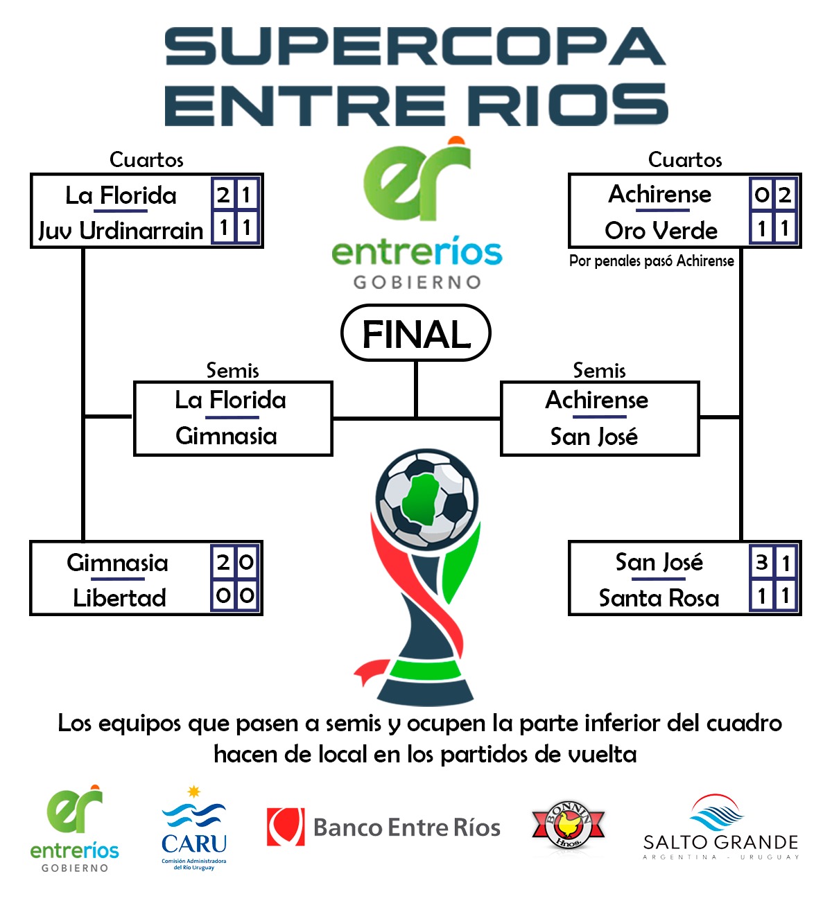 Tras la disputa de los mismos, La Florida de Chajarí, Gimnasia de Concepción del Uruguay, Achirense y Social y Deportivo San José obtuvieron la clasificación a las semifinales del torneo más importante de clubes entrerrianos.